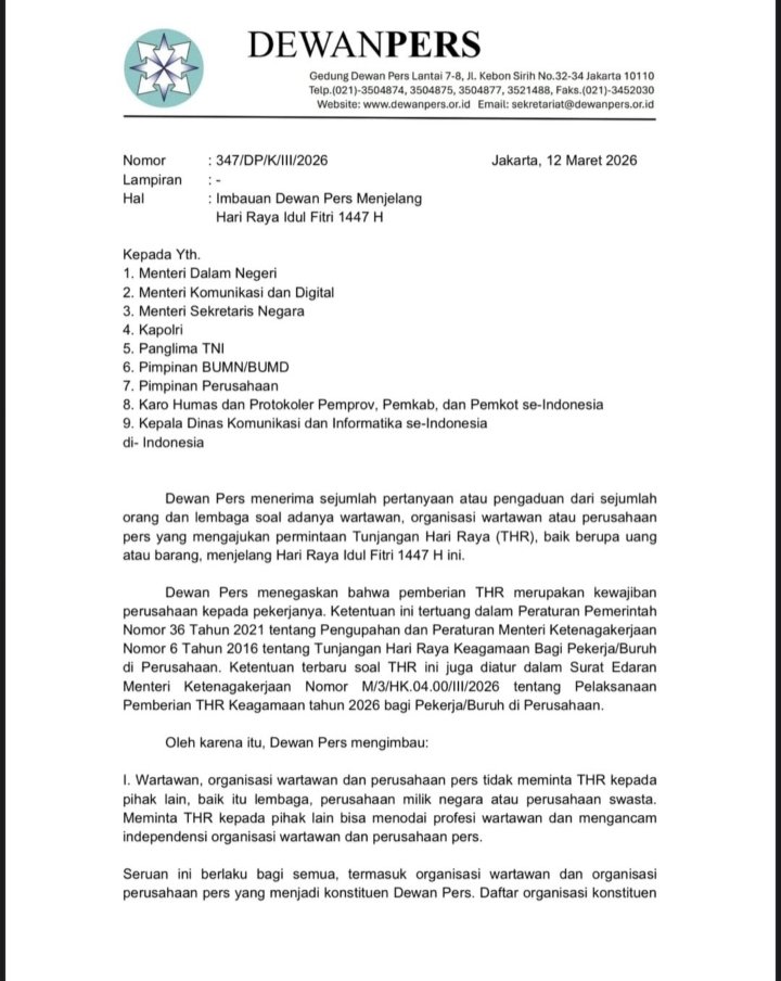 JAKARTA,SIBER77.COM – Dewan Pers mengeluarkan imbauan kepada wartawan, organisasi wartawan, dan perusahaan pers agar tidak meminta Tunjangan Hari Raya (THR) kepada lembaga pemerintah, BUMN, maupun perusahaan swasta menjelang Hari Raya Idul Fitri 1447 Hijriah.