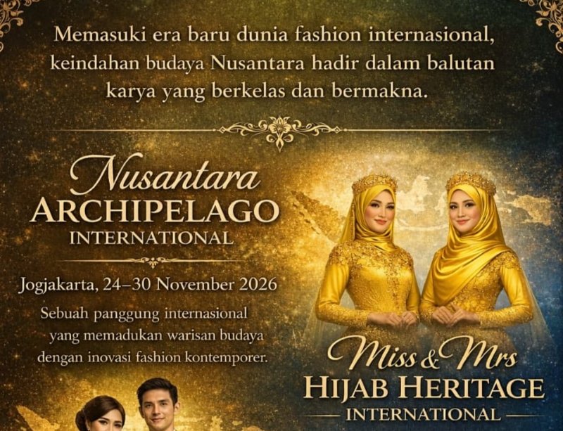 Indonesia jurnalis Pemilihan Nusantara Archipelago International akan diselenggarakan di Yogyakarta pada 22–30 November 2026, sementara ajang Miss & Mrs Hijab Heritage International akan berlangsung di Sumatra Barat pada 1–8 November 2026. Kedua acara ini akan menghadirkan para finalis dari berbagai negara yang datang bersama tim masing-masing untuk mengikuti rangkaian kegiatan berskala internasional.
