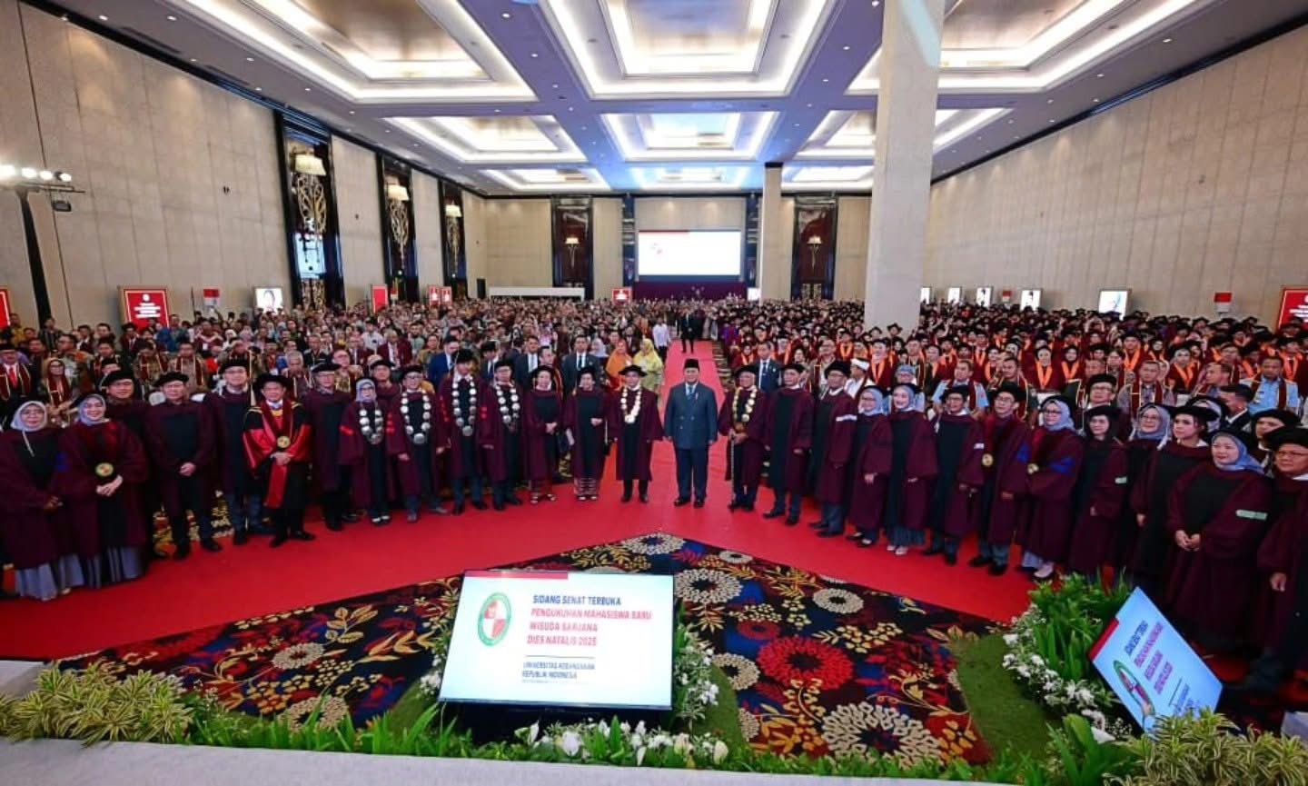 BANDUNG — Presiden Prabowo Subianto mengajak generasi muda Indonesia untuk berani memilih jalan kebenaran meskipun penuh tantangan dan kesulitan. Ajakan tersebut disampaikan Presiden saat menyampaikan orasi ilmiah dalam Sidang Senat Terbuka dalam rangka Pengukuhan Mahasiswa Baru Sarjana dan Magister Tahun Ajaran 2025/2026, serta Wisuda Sarjana sekaligus Dies Natalis Universitas Kebangsaan Republik Indonesia (UKRI) Tahun 2025 di Kota Bandung, Provinsi Jawa Barat.
